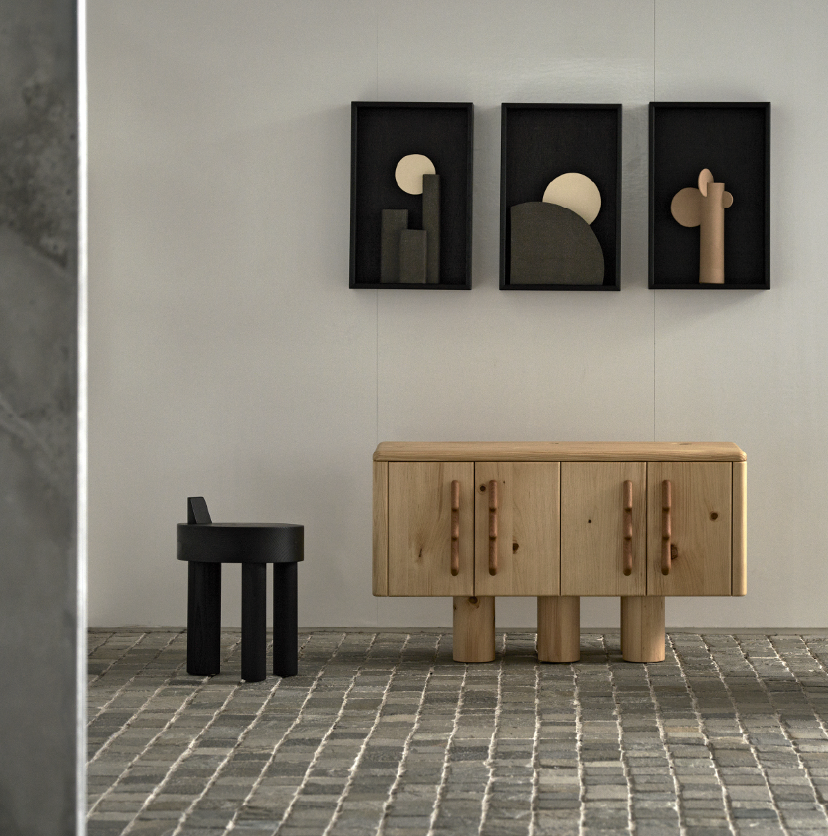 This is my first collection, themed "It's not sophisticated, but it has a certain charm." The Japanese word "yabottai" ( 野暮ったい ) often carries a negative connotation, but I've chosen to reinterpret it positively, transforming it into something endearing. While allowing a hint of human touch, I embrace the quirky nuance that draws people in, even if it isn't stylish in the conventional sense. I blend simple yet catchy forms with the atmosphere created by materials and textures, presenting them as a hybrid of functional furniture, such as chairs and cabinets, and artistic objects.