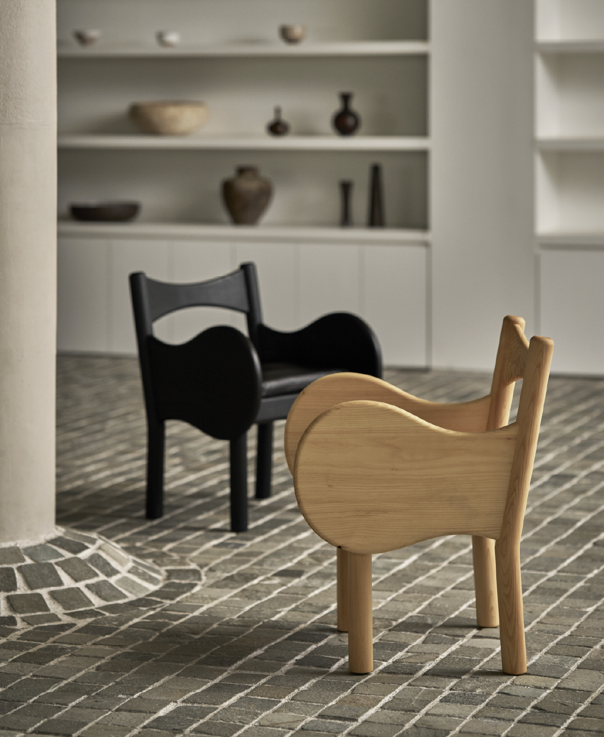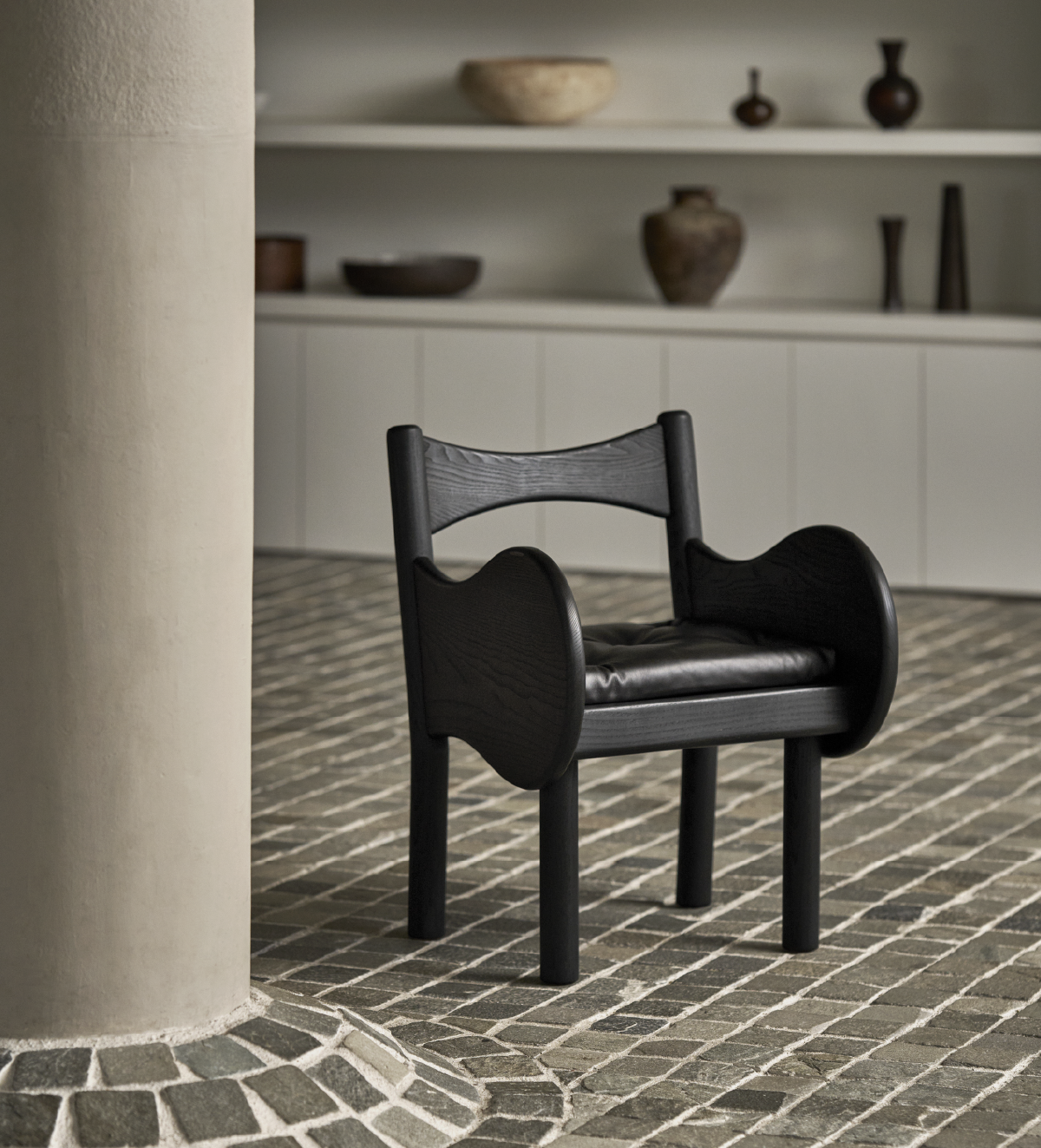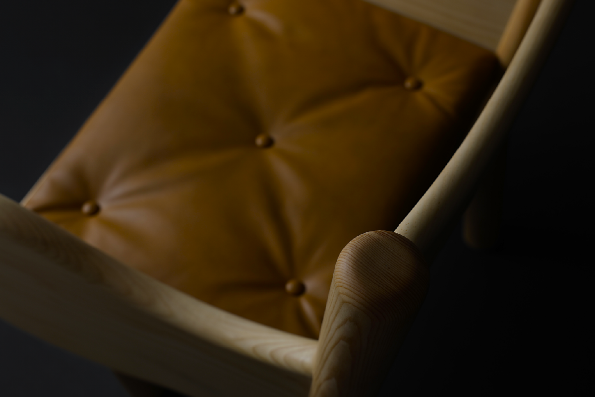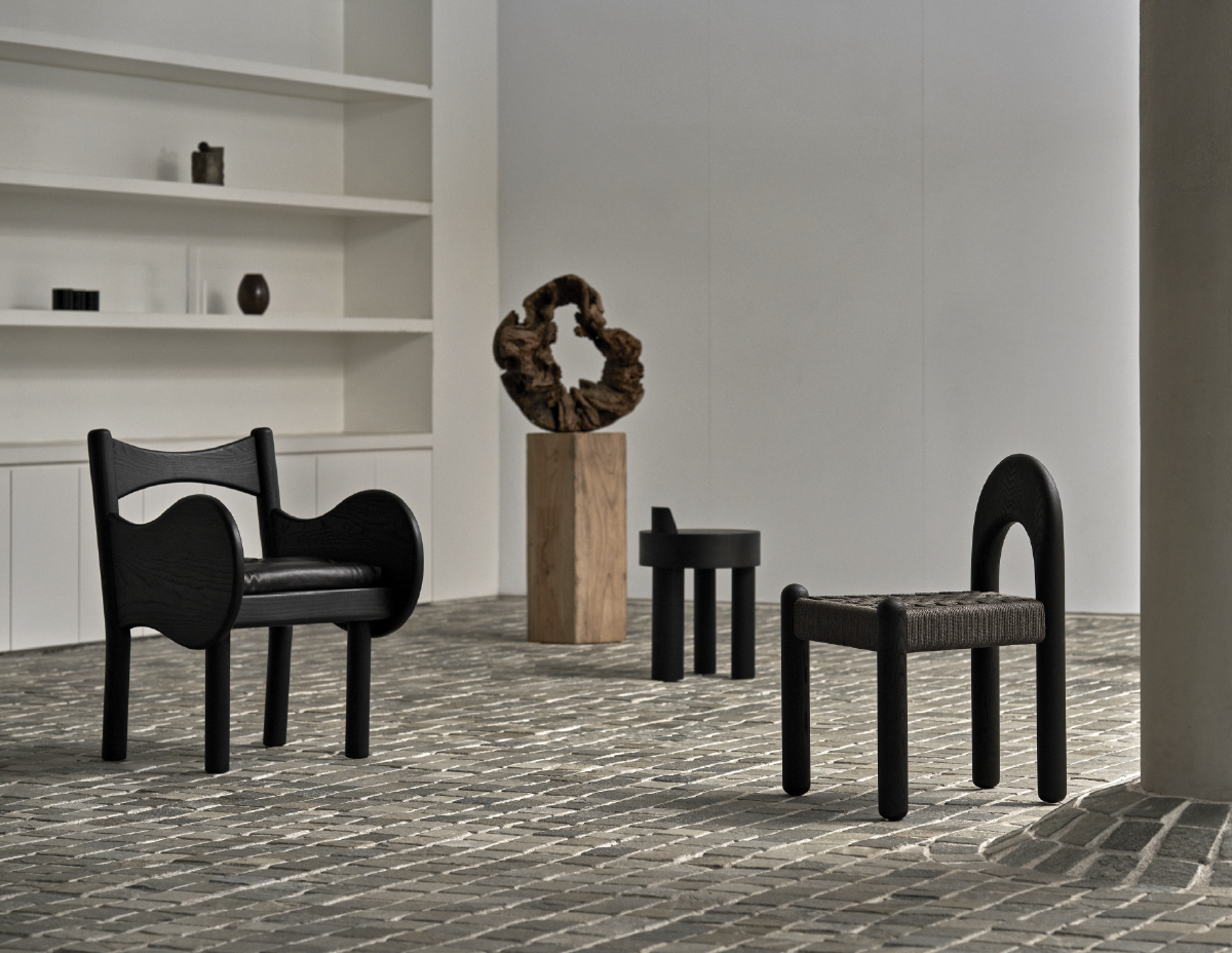 The Hug armchair, with its distinctive curved arms, looks as if it's reaching out with open arms, inviting you in with a gentle embrace.The Black ver. uses iron acetate, which reacts with the tannins naturally present in the wood, resulting in a deep, rich black finish that retains the wood grain and vessels, unlike typical black paint finishes.